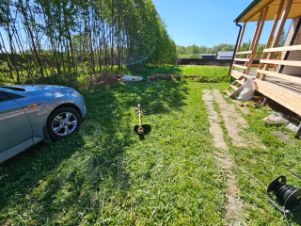 Забора фактически нет с двух сторон: лицевая сторона 25-27 метров и правая сторона участка 40 метров. 1 взрослый собственник.