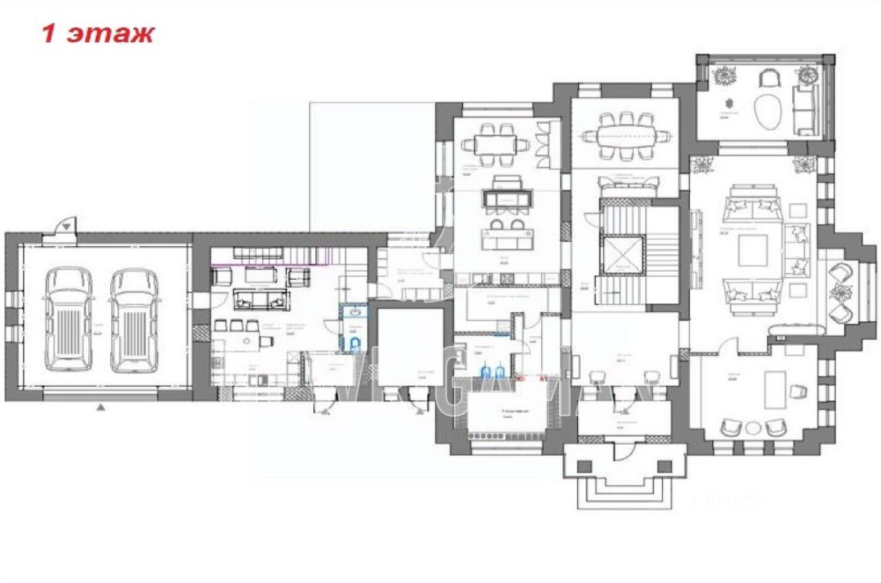 1 этаж - холл со вторым светом, кухня-столовая, столовая для приема гостей с вторым светом 8 метров, большая гостиная, кабинет, патио, блок для персонала с 2 спальнями, с/у и кухней, гараж на 2 а/м;