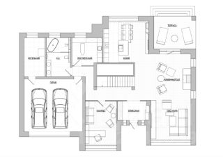 - 1 этаж - прихожая, холл, спальня-кабинет, гараж на 2 машиноместа, котельная, санузел, прачечная, терраса, кухня, гостиная со вторым светом, лестница,