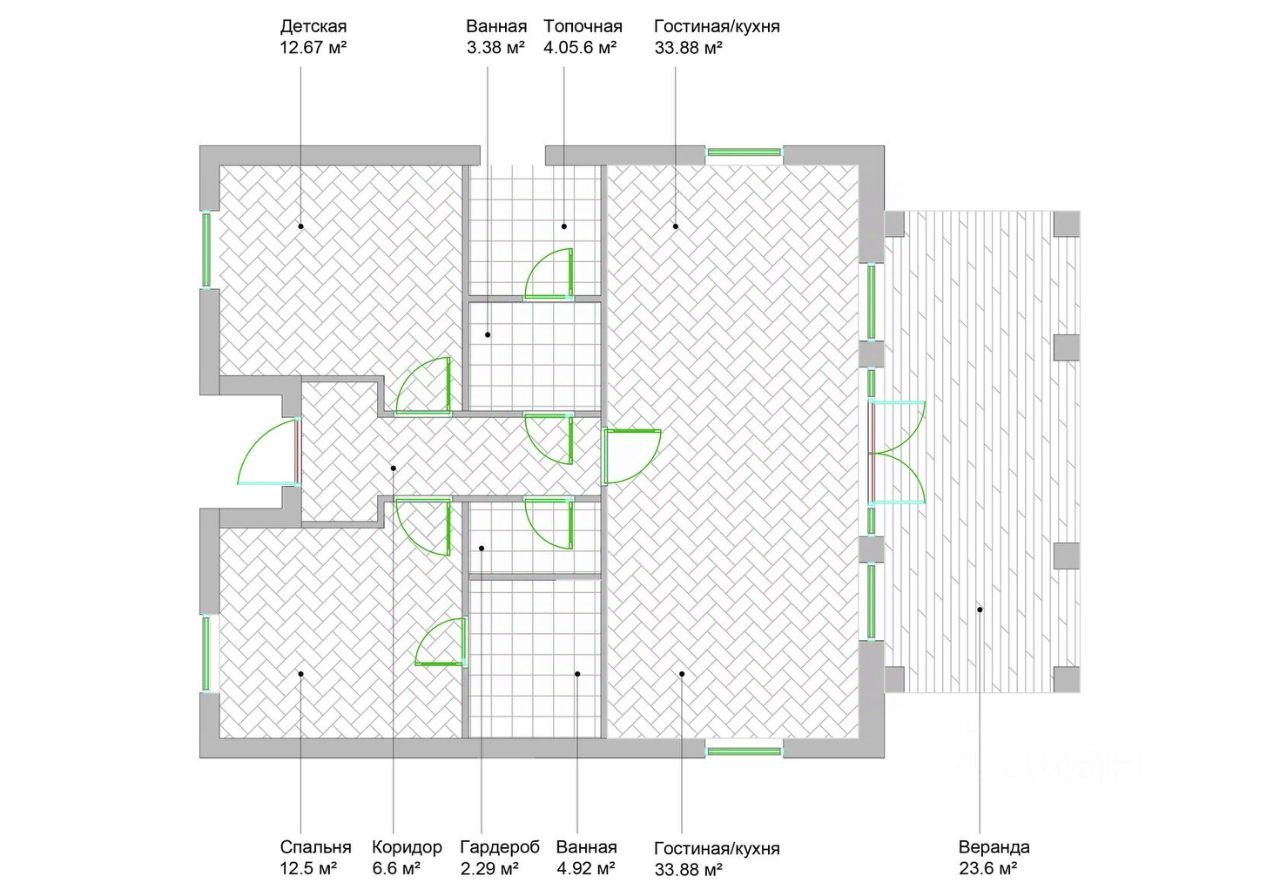 Общая площадь: 107.3 м2 (83.7 м2 дом + 23.6 м2 теплая застекленная веранда)