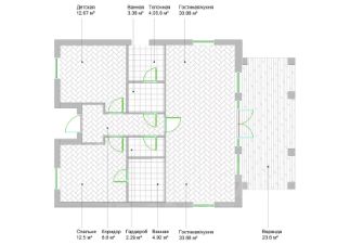 Планировка: 2 спальни (12.8 м2 и 12.9 м2), 2 санузла, гостиная-кухня 22.5 м2, кабинет/детская 11 м2