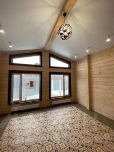 — Внутренняя отделка заключается в окраске деревянных панелей и ламелей хвойных и лиственных пород, отделка стен санитарных узлов керамогранитом и лиственницей, напольные покрытия из керамогранита и паркетная доски, натяжных потолков, межкомнатных дверей. Элементы дизайна, представленные на фотографиях являются дополнительной опцией. Наружная отделка исполнена из деревянных ламелей хвойных пород, композитной террасной доски, ограждающих конструкций с применением тонированного стекла.