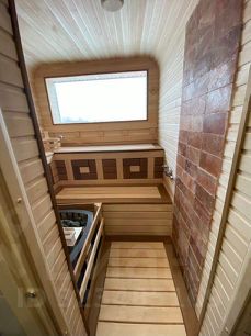 — Сауна в доме является доп. Опцией и выполняется из отделки вагонкой из липы, полковых досок из ольхи, оконных и дверных блоков и электрической печи для сауны.