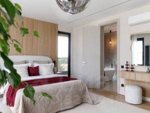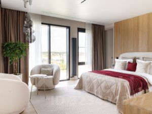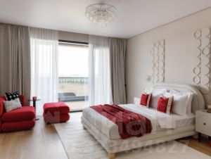 мастер-спальня с панорамным остеклением, гардеробной, выходом на балкон и личным С/У, в котором также есть ванная, душ и панорамное остекление.
