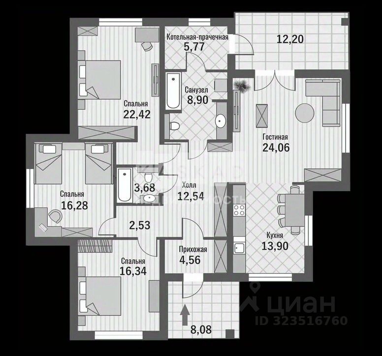 В планировке: три спальни, включая мастер-спальню 22 м², гостиная 24 м² с выходом на террасу и отдельная кухня 14 м², два санузла, котельная-прачечная и удобный холл. Благодаря продуманному зонированию гостиная и кухня объединены в единое светлое пространство, а спальные комнаты расположены в тихой части дома.