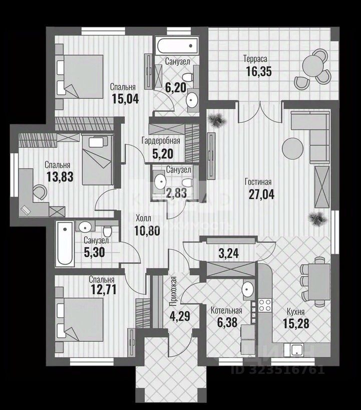 В планировке: три спальни, включая мастер-спальню с личной ванной и гардеробной, гостиная 27 м² с выходом на террасу 16 м², отдельная кухня 15 м², три санузла, котельная и удобный холл. Дом спроектирован так, чтобы пространство было светлым, функциональным и комфортным для жизни круглый год.