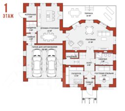 1 этаж: холл, гардеробная, с/у, кабинет, постирочная, кухня-столовая, гостиная, гараж на 2 машиноместа, котельная, кладовая.