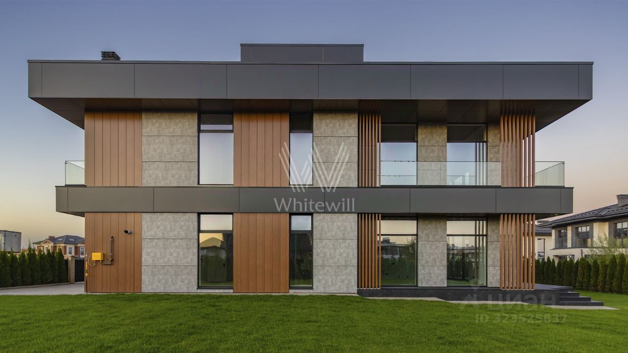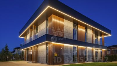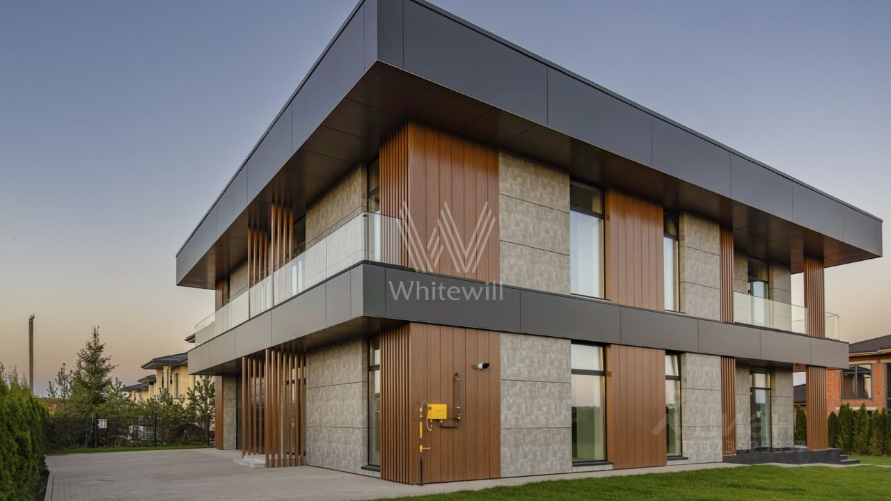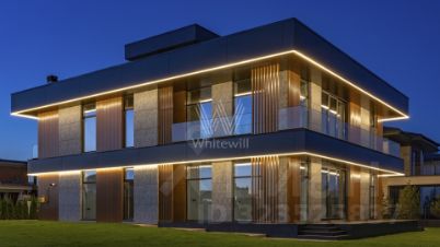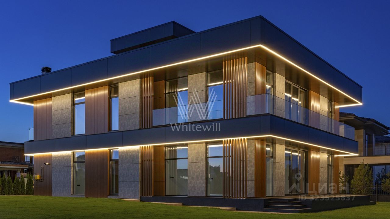 Millennium Park. Новый загородный коттедж площадью 878 м² расположен на полевом участке 15 соток. Современный фасад облицован долговечными композитными панелями, а продуманная подсветка гармонично подчёркивает строгие линии здания. Панорамные окна Alutech с итальянскими электроприводами стирают грань между природным окружением и внутренними пространствами, залитыми естественным светом.