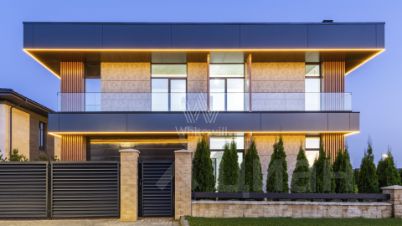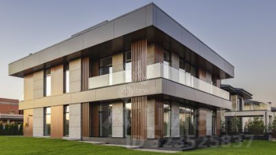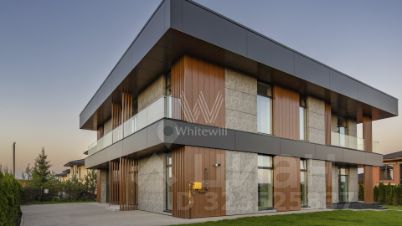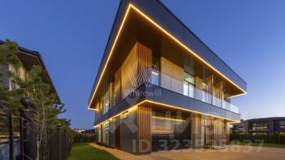 Планировка включает просторную гостиную-кухню-столовую, четыре спальни с вместительными гардеробными, кабинет, блок для персонала и двухместный гараж. На третьем уровне разместили комнату отдыха с выходом на эксплуатируемую кровлю площадью 320 м², где на высоте восемь метров можно насладиться уединением и полюбоваться живописным закатом. На участке со свежескошенным газоном и стройными туями, высаженными по периметру, можно обустроить уютную беседку-барбекю и детскую площадку для активного отдыха.