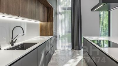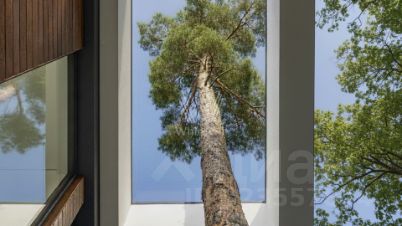Веледниково. Загородный коттедж площадью 650 м² расположен на живописном лесном участке 18 соток. Современный фасад, сочетающий белоснежную штукатурку, камень и дерево, органично вписан в ландшафт — высокая сосна эффектно произрастает сквозь конструкцию террас. Панорамные окна стирают грань между окружающим лесом и наполненными солнцем внутренними пространствами. Интерьеры оформлены в светлых, спокойных тонах, а также дополнены контрастными деталями. Встроенная мебель и бытовая техника сделают жизнь здесь комфортной.