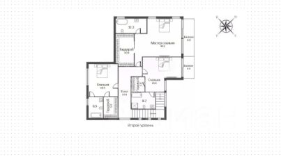 • Второй уровень: холл, мастер-спальня с гардеробной, санузлом и балконом, спальня с гардеробной, санузлом и балконом, спальня с гардеробной и санузлом.