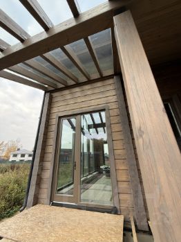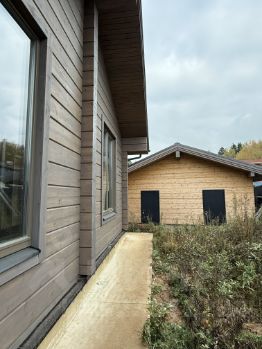Дом построен на монолитном фундаменте, выполнен дренаж по периметру дома, дом покрашен маслом OSMO, кровля - мягкая черепица, монтирована водосточная система, деревянные окна Wooder, снаружи монтированы подшивы, наличники, весь тепловой контур полностью закрыт, установлена временная входная дверь. Год постройки 2024-2025.
