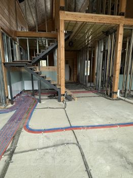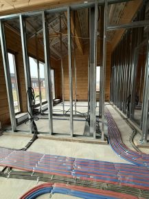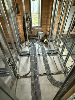 Внутренняя отделка: в Доме выполнена полностью разводка инженерных коммуникаций - электрики, водопровода и канализации, отопления, разводка коллекторов теплых полов (согласно дизайн-проекта). Монтированы каркасы перегородок. Установлена лестница.