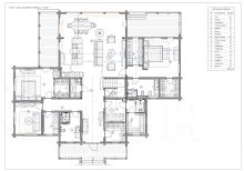 Планировка: В доме предусмотрены 2 мастер-зоны со своим су и гардеробной. Также в отдельной части дополнительно 2 спальни, большая гардеробная, большой су. По проекту предусмотрена сауна с комнатой отдыха. Открытая зона кухни-гостиной, зона камина, кладовая. В доме 2 террасы.