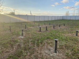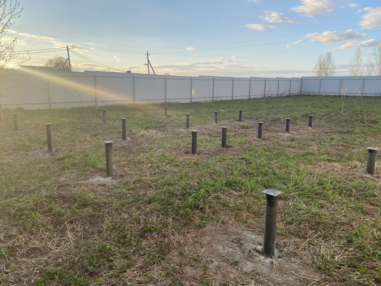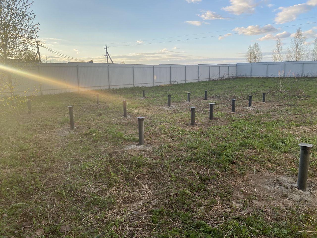 участок правильной формы, ровный. Есть забор, откатные ворота, калитка, свайный фундамент 6х9