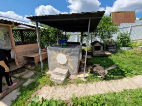 На участке беседка, небольшая мангальная зона, тандыр, курятник. Посажены дереваья, яблоня, груша, слива, вишня, черешня, грецкий орех, лесной орех, каштан, и кустарники смородина, крыжовник, виноград, клубника.