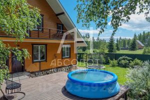На территории расположена терраса, бассейн, батут, качели.