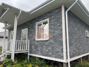 Фундамент бетонные сваи, фасад дома отделан современным материалом, стены дома каркасно-щитовые утеплены, внутри стены покрашены и отделаны имитация бруса; окна -ПВХ (двойной стеклопакет), крыша - металлочерепица (четырехскатная).