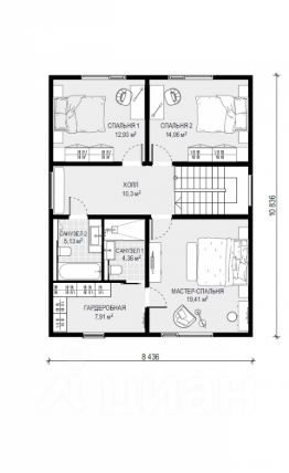 - Количество этажей — два, включая гостиную, кухню-столовую, кабинет и санузел на первом этаже, три спальни на втором этаже.