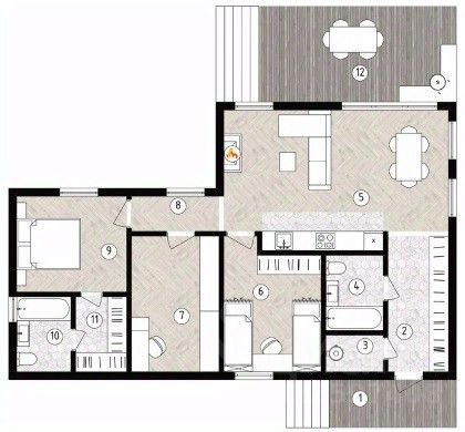 В целях экономии мы подобрали минимальные размеры для вспомогательных помещений и спален, планировка дома эффективно использует каждый сантиметр площади, начиная от входа.