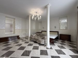 1 эт.: большая прихожая, холл, просторная хозяйская спальня с гардеробной и санузлом, гостевая спальня, огромная кухня столовая гостиная с выходом на видовую террасу из лиственницы, большой санузел, а также топочная и кладовая.