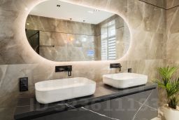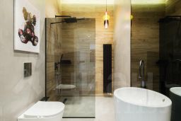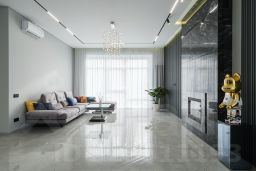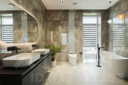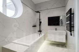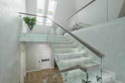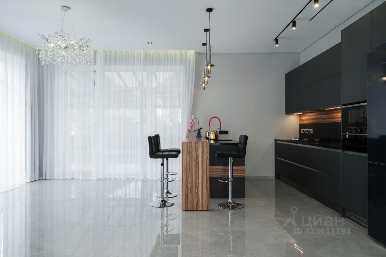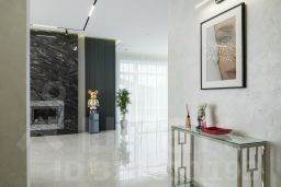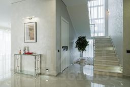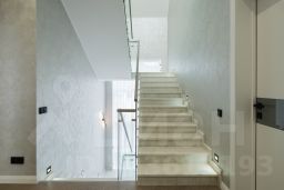 выполнен ремонт "под ключ" в современном стиле: полы керамогранит, паркетная доска, стены фактурная покраска с элементами современного декора, венецианская штукатурка, керамогранит, плитка, многоуровневые подвесные потолки с трекинговой системой освещения, мраморные лестницы и подоконники, установлены импортная сантехника, встроенная кухня со всей бытовой техникой, мягкая мебель.