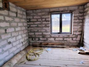 Фундамент дома ленточно-свайный, лента 1 м, свая 2 м. Цоколь - бетоноблоки. Стены - газоблоки ("ЭКО" Смоленск). Стены утеплены (Технониколь), потом обрешочены и оштукатурены. Полы - черновая отделка доска 40мм. Полы, крыша и перекрытия утеплены минватой во всем доме. Перекрытия первого этажа и крыша упираются на бетонный пояс. Перекрытия второго этажа упираются на кирпичный пояс. Окна стеклопакеты. Крыша металлочерепица.