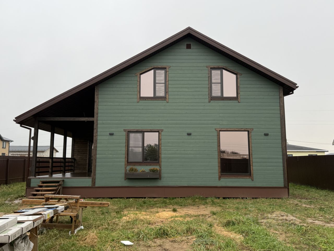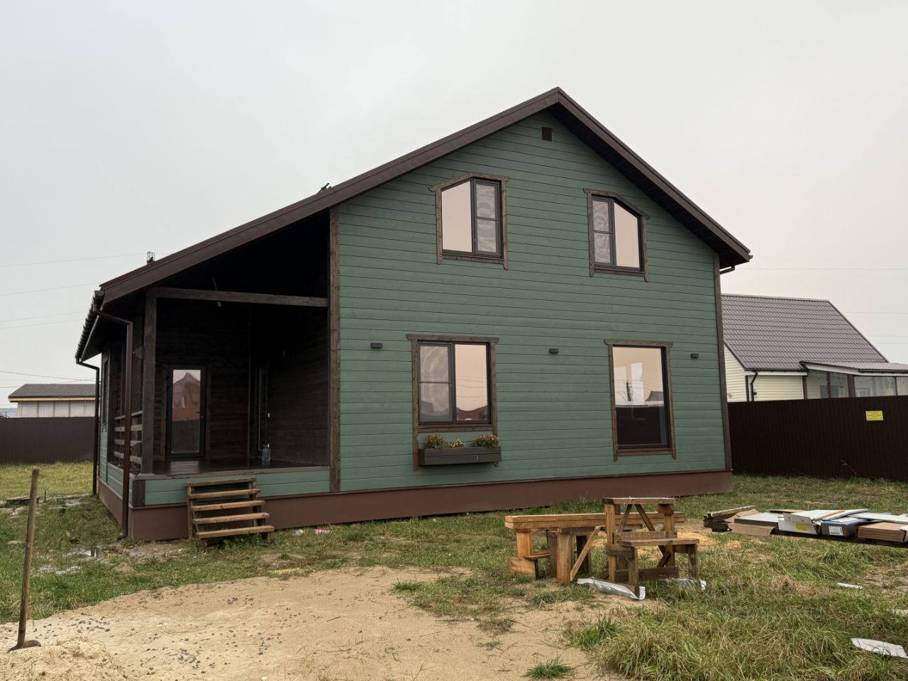 • Дом расположен на участке 7.5 соток, огорожен забором из проф настила, ворота откатные, сделан заезд из щебенки.
