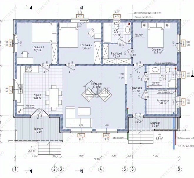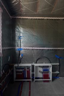 В доме выполнена разводка сетей водоснабжения, радиаторного отопления, электропроводки, канализации. Смонтированы коллекторные узлы. Выполнены черновые полы.