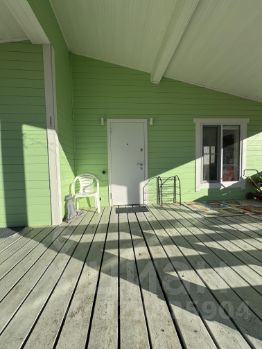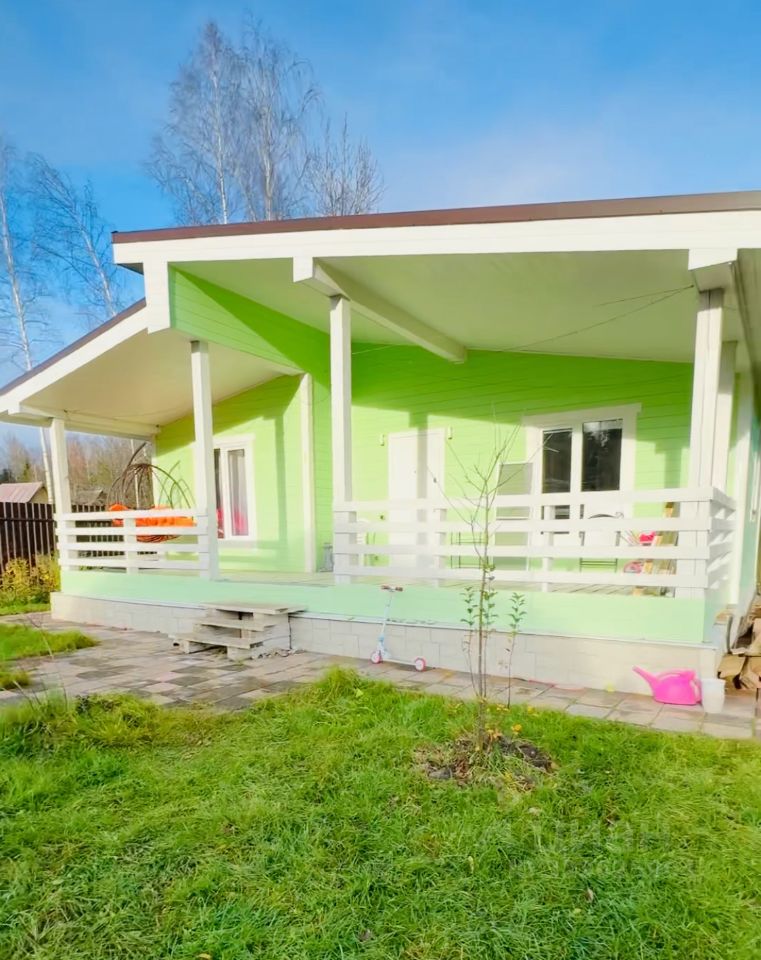 Салатовый домик с белыми окнами гармонично вписан в зелень сосен и берёз.