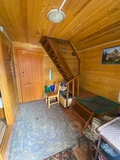 ДОМ: 1-й этаж большая комната, кухня; 2-й этаж три комнаты. Дом щитовой, отделанный сайдингом, крыша ондулин, отопление электрическое, сан узел на улице.