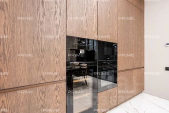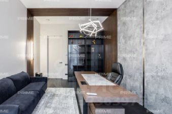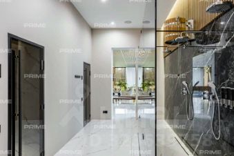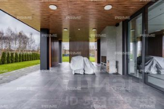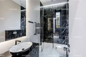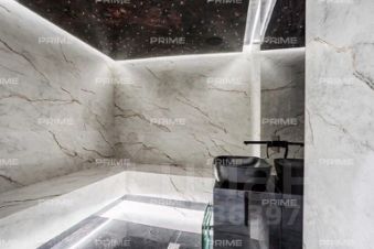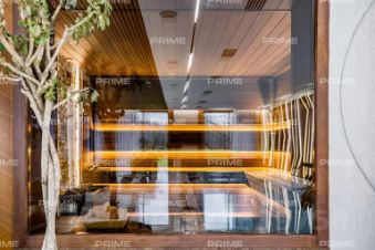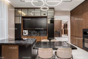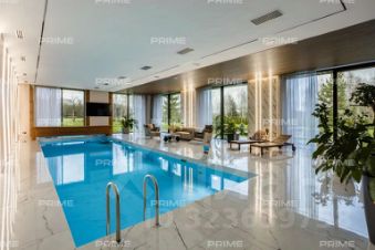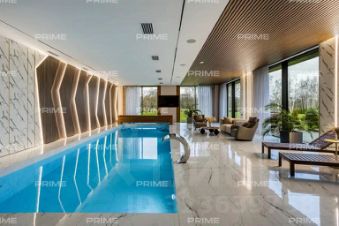 На первом этаже расположены просторный холл с гардеробной, кухня, столовая с выходом на открытую веранду и дровяным камином-барбекю, гостиная с паровым камином, кабинет, гостевой санузел и спальня. Особое место занимает спа-зона площадью 200 кв. м: хаммам со "звездным небом", сауна с панорамным остеклением в бассейн, три душевые с обливным ведром, плавательный бассейн 105 м, а также зона отдыха с мягкой мебелью, шезлонгами и ТВ.