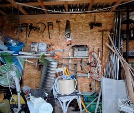 Электричество подключено, есть помещение под будущую баню (не достроено).