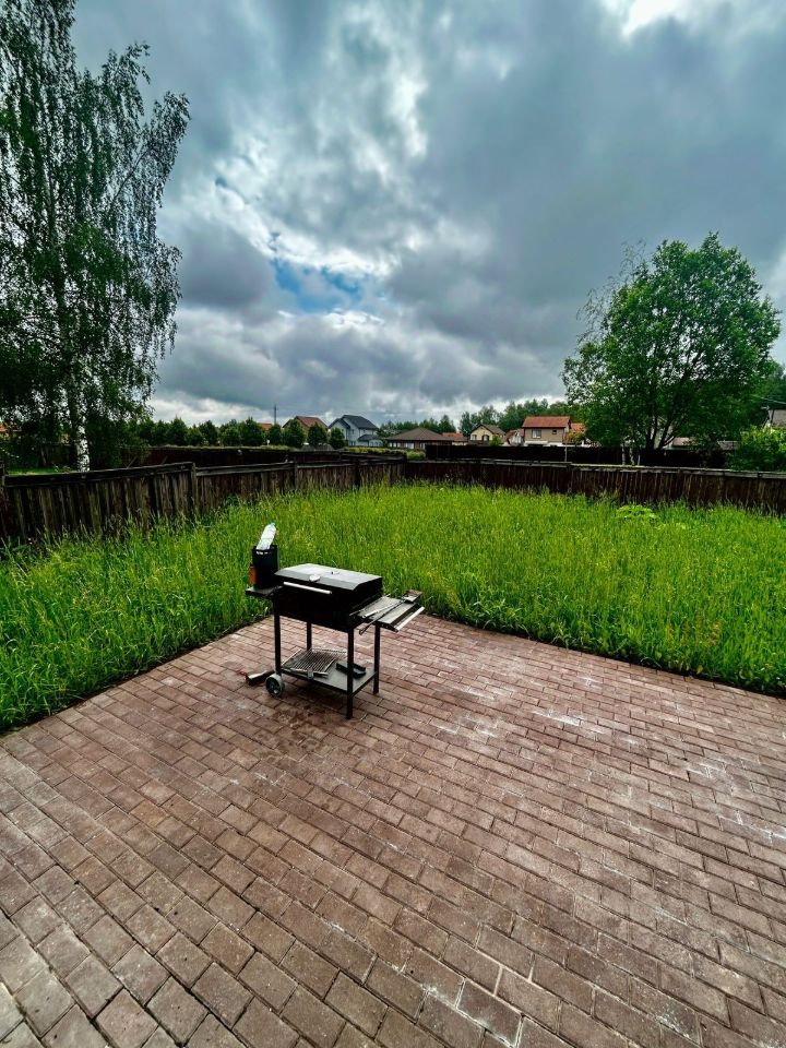 — подъезд к гаражу выложен плиткой, сзади дома тоже плитка и красивый газон