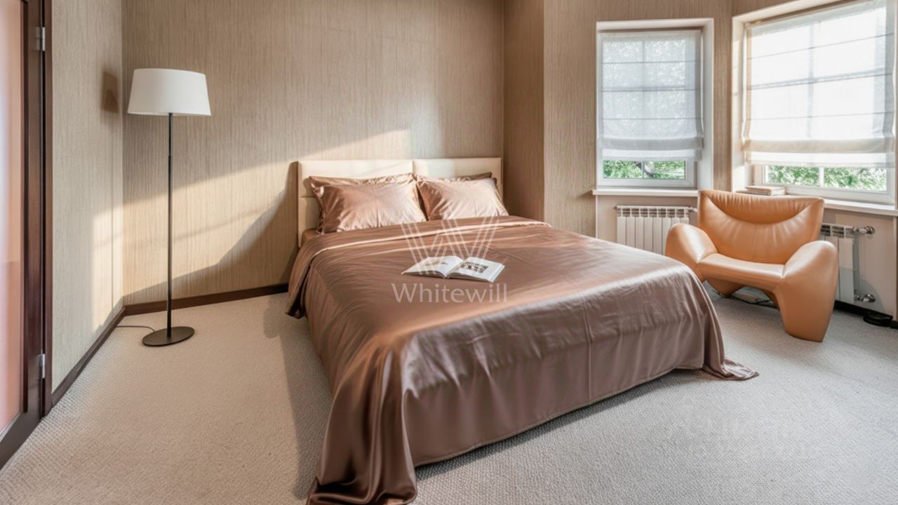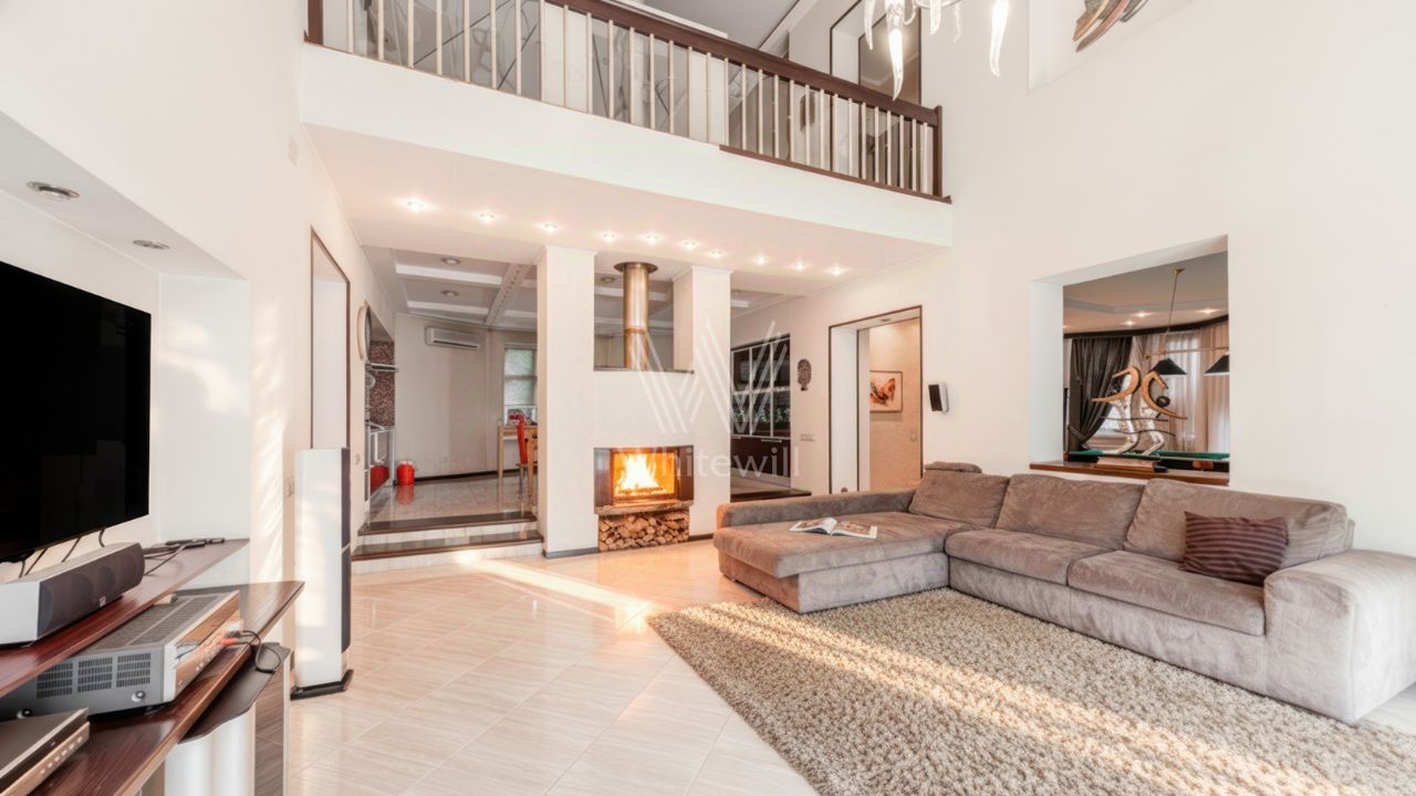 Сердцем дома стала уютная гостиная с двухсторонним камином, объединённая с кухней-столовой, а для комфорта жителей и их гостей планировка включает 4 спальни, бильярдную и сауну. Оставить автомобиль можно во встроенном гараже. На участке вдохните запах свежескошенной травы, прогуливаясь по мощеным дорожкам в тени высоких деревьев, и любуйтесь декоративными кустарниками. Вечерние посиделки на террасе с видом на небольшой собственный пруд станут еще более романтичными благодаря мягкой уличной подсветке.
