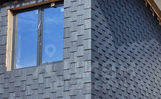 Фасад облицован плиткой ручной формовки в сочетании с натуральным итальянским сланцем в виде чешуи дракона .