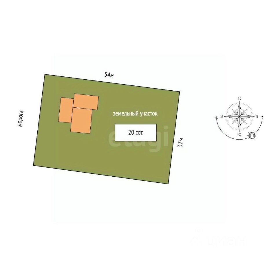 Участок площадью 2000 кв.м имеет правильную прямоугольную форму, огорожен забором из профнастила и благоустроен: здесь расположена площадка для барбекю, зона с плодовыми деревьями и туями, а также забетонированная площадка для парковки и дорожки из брусчатки.