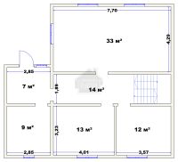 На 1-м этаже расположены прихожая 7 кв. м., бойлерная 9 кв. м., смежный санузел 13 кв. м., большая кухня-гостинная 33 кв. м., комната 12 кв. м. Высота потолков 2,7м.