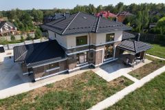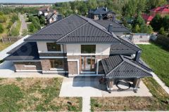 Дом общей площадью 316,41 м² возведён из современных и долговечных материалов. Теплоэффективный керамический блок Kaiman, облицовка из сверхнадежного клинкерного кирпича ручной формовки, надёжная монолитная основа, стропильная система из обработанной лиственницы и кровля из штучной черепицы — всё это гарантирует долговечность и комфорт проживания нескольким поколениям хозяев. Высота потолков в доме более 3 м, а в зоне "второго света" около 7м. С домом интегрирован навес под 2 автомобиля и гараж для малой техники.