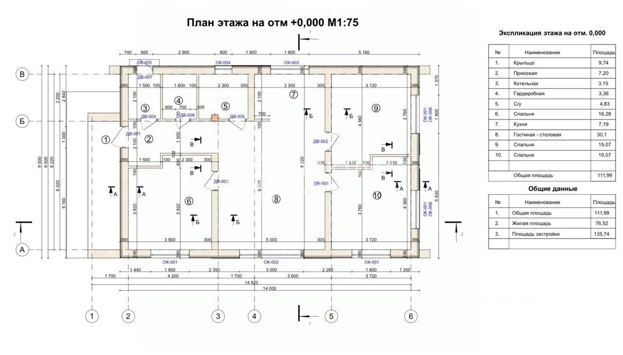 Общая площадь блочного дома составляет 111,99 кв. м., жилая 76,52 кв.м.(15,07+15,07+16,28+30,1).