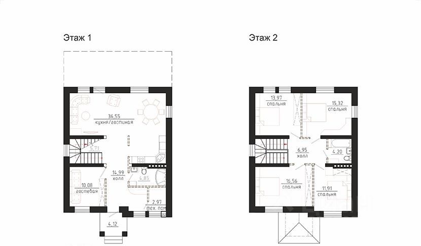 1 этаж: кухня-гостиная с панорамным окном и выходом на веранду, санузел, спальня или кабинет, бойлерная.