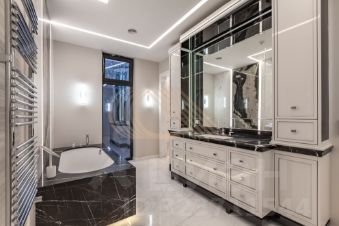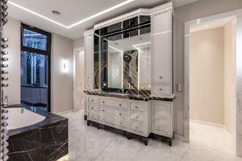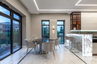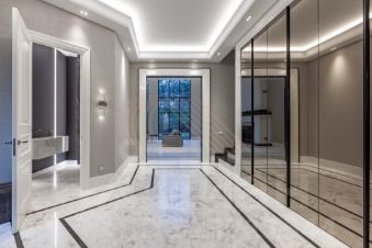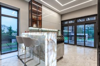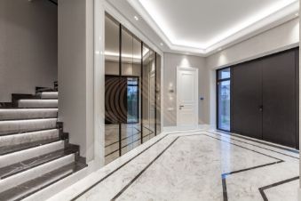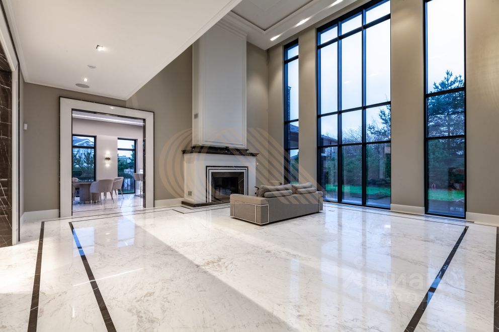 9. Дом строился для себя, а не под продажу, поэтому никогда не жалели денег на коммуникации, инженерию, отделку, мебель и технику: в доме уложено более 260 квадратных метров ценных пород итальянского и испанского мрамора огромными слэбами. На полу уложен благородный паркет Gran Parte Французская елка Rovere Caramello. На кухне установлена техника Kuppersbucsh и Miele. Применена надёжная и дорогая технология утепления - пеностекло которое сохраняет свои уникальные теплоизоляционные свойства на протяжении всего срока эксплуатации дома.