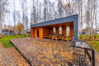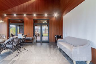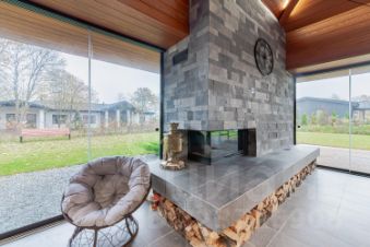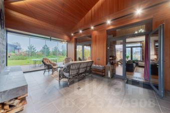 Веранда с камином и домашним кинотеатром, патио и мангальной зоной для уютных вечеров: отделка массив лиственницы, теплый пол, редкий экземпляр дровяной камин из Италии бренда PIAZZETTA.