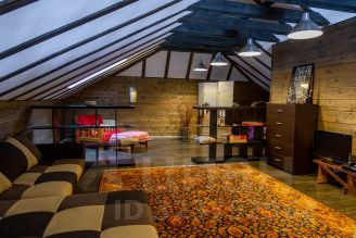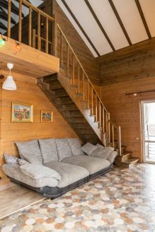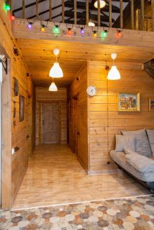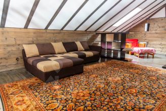 Лестница ведёт на мансардный этаж площадью 65 м2 открытой планировки с выделенной спальной зоной и санузлом площадью 4м2 с ванной.