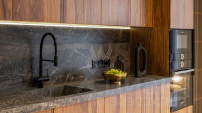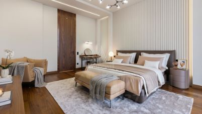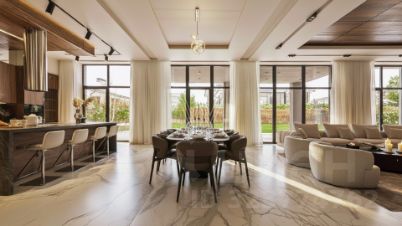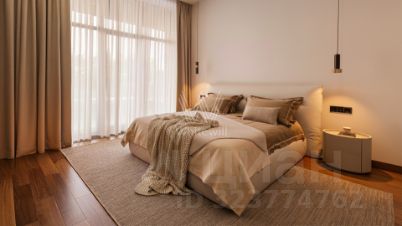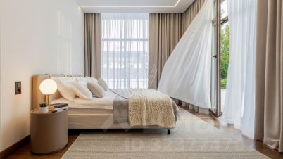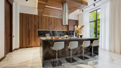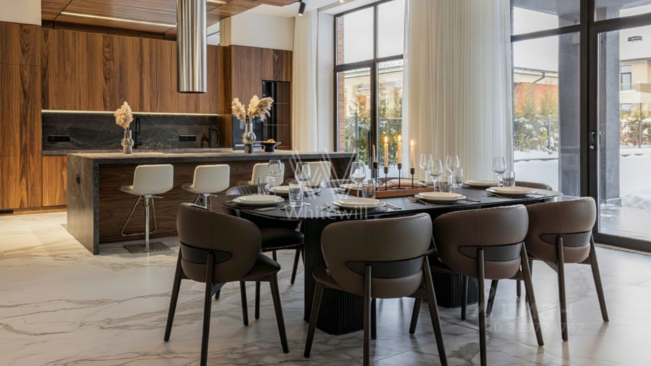 Интерьеры оформлены в современном стиле, где преобладают мягкие нейтральные оттенки. Натуральные древесные текстуры вносят акценты, добавляя пространству теплоту и сложность. Панорамные окна и многоуровневые потолки с тщательно продуманным освещением создают игру света и тени, создавая атмосферу уюта и гармонии. Дом полностью меблирован и укомплектован техникой от ведущих производителей.