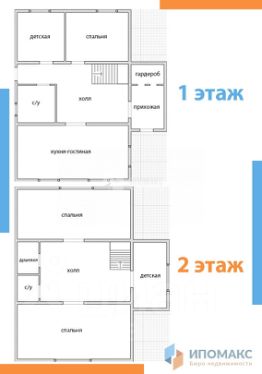 1 этаж: прихожая, котельная, холл, санузел, кухня-гостиная, спальня, детская комната.