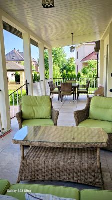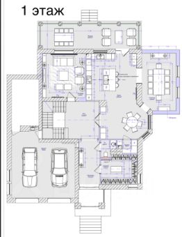 - Первый этаж: прихожая, гардеробная, холл, гостиная с выходом на веранду, кухнястоловая, гостевой санузел и гараж на 2 машины.