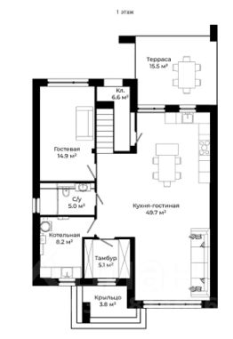 Первый этаж: кухня-гостиная 50 кв.м, кладовая под лестницей, гостевая спальня, с/у, бойлерная, постирочная, терраса.