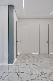 Потолок: натяжной, световые линии, скрытый карниз, люстры.