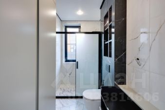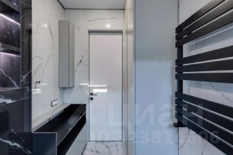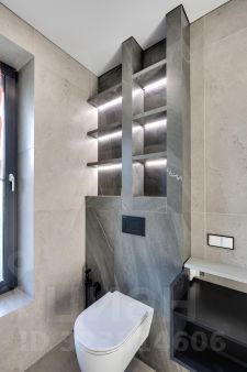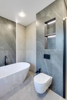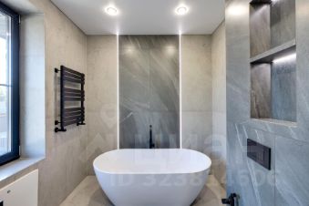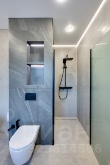 Сантехника: душевой уголок, водяной полотенцесушитель, безободковый унитаз.
